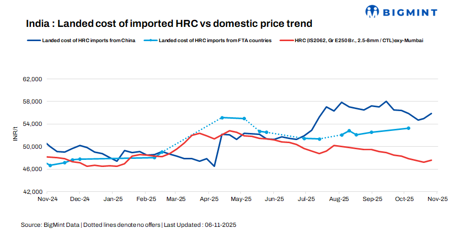 Domestic HRCs are likely to remain more cost-competitive than Chinese and Japanese imports, with the safeguard duty and BCD keeping import prices high. However, a gradual post-festive demand recovery, anticipated November list price hikes, and limited supply due to BF/HSM maintenance may lead to modest domestic price increases.