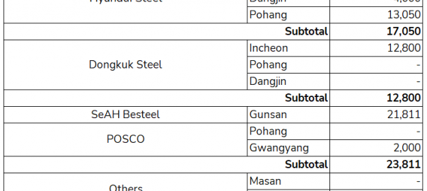SeAH Besteel: SeAH Besteel’s scrap import volumes were largely stable w-o-w. The company sourced 21,811 t that came to Gunsan Port.
