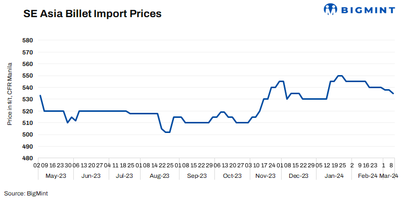 According to BigMint’s bi-weekly assessment, billet import prices dipped by $3/tonnes (t) w-o-w to $535/t CFR Manila on 8 March 2024.