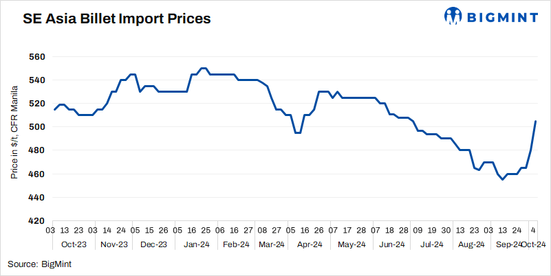 BigMint’s bi-weekly assessment of billets (150 x 150 mm, 3SP) imported by the Philippines rose by $40/t to $505/t w-o-w CFR Manila on 4 October. Billet import offers stood at the range of $500-510/t CFR Manila.