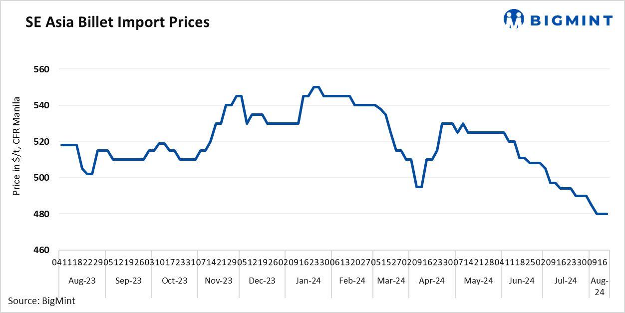 BigMint’s bi-weekly assessment reported that billets (150x150mm, 3SP) imported by the Philippines were priced at $475-485/t CFR Manila. However, no transactions were reported at these levels.