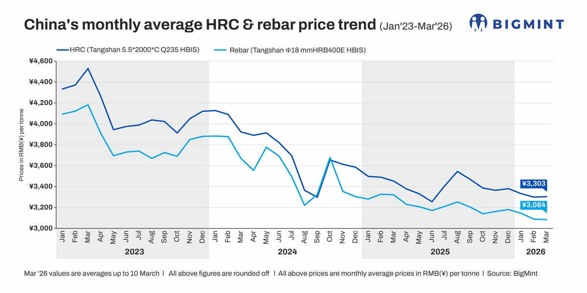 HRC prices decline m-o-m amid seasonal manufacturing slowdown: HRC prices moved lower during February as trading activity weakened significantly during the Lunar New Year holidays. At the start of the month, many downstream manufacturers slowed or temporarily halted production, leading to reduced procurement of flat steel products. Market participants reported that purchases were largely limited to immediate requirements, with buyers delaying restocking until after the holiday period.