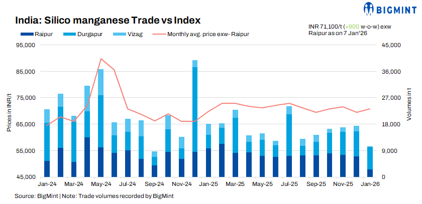 Silico prices firm as key smelters report deals at elevated levels: Smelters continued to maintain firm price levels, supported by sustained acceptance of higher-priced material and the absence of successful transactions at discounted rates. Key producers concluded trades at around INR 71,300/t exw Raipur and Durgapur, which effectively set a market benchmark. Other major domestic smelters subsequently aligned their offers comparably, reinforcing market-wide price discipline. Furthermore, reports of several smelters being fully booked until March surfaced, which threatens spot availability, creating a supply-side tightness that has provided additional support to prices.