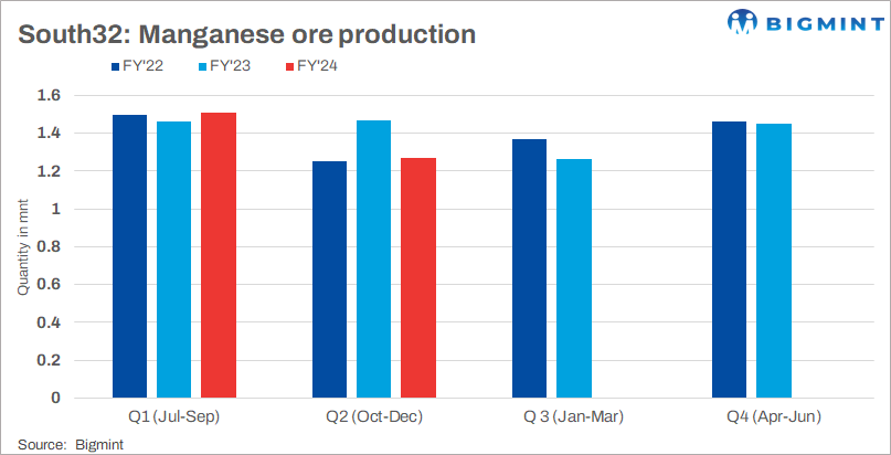 In Q2FY24 (Oct-Dec), South32’s manganese ore production decreased by 16% q-o-q to 1.272 wmnt. Australia Manganese fell by 11% to 0.789wmnt, and South Africa Manganese declined by 23%, reaching 0.483wmnt, as lower yields impacted secondary production at Australia Manganese, and South Africa Manganese completed planned maintenance.
