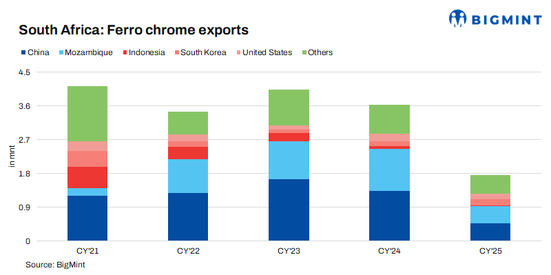 In CY’25, South Africa’s ferro chrome exports fell by 51% y-o-y to 1.77 million tonnes (mnt) against 3.64 mnt in CY’24. With the power tariff reduction, global trade flows might improve, as South Africa is a key ferro chrome producer and exporter.