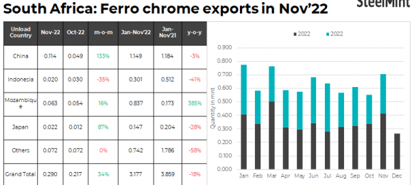 • South Africa’s ferro chrome exports rose by 34% to 0.29 mnt in Nov’22 compared to 0.21 mnt in Oct’22.