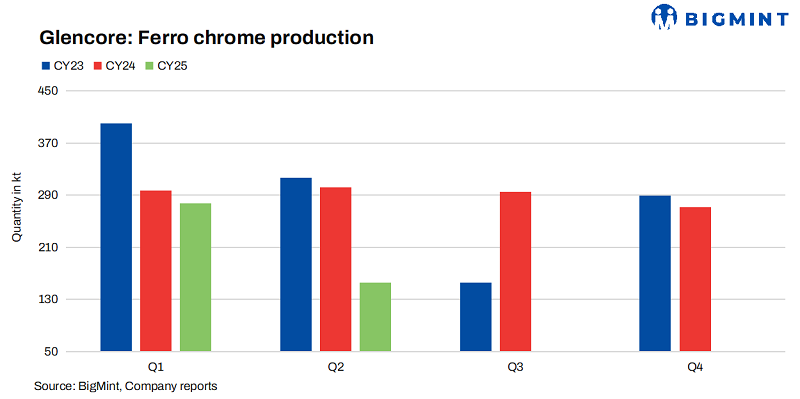 Glencore, a leading South African ferro chrome producer, posted a 28% drop in output to 433,000 t in H1CY’25, from 599,000 t in H1CY’24. Production also declined by 43% to 156,000 t in Q2CY’25, from 277,000 t in Q1CY’25. The drop was driven by the suspension of Boshoek and Wonderkop smelters in May-Jun’25 due to weak margins. The Lion smelter was also temporarily offline for scheduled maintenance and rebuilds.