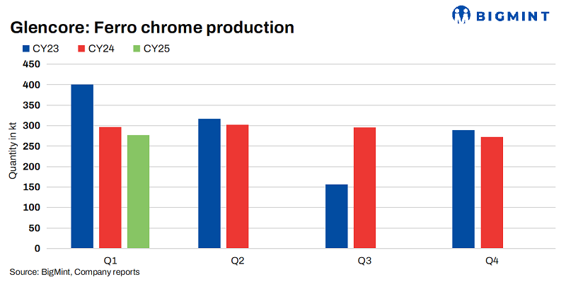 Glencore, a leading South African ferro chrome producer, recorded a 2% q-o-q rise in production which reached 277,000 t in Q1CY’25, up from 272,000 t in Q4CY’24. However, output fell by 7% y-o-y compared to 297,000 t in Q1CY’24. The y-o-y decline in output reflects weak market conditions and smelter shutdowns, with the company responding through proactive operational adjustments.