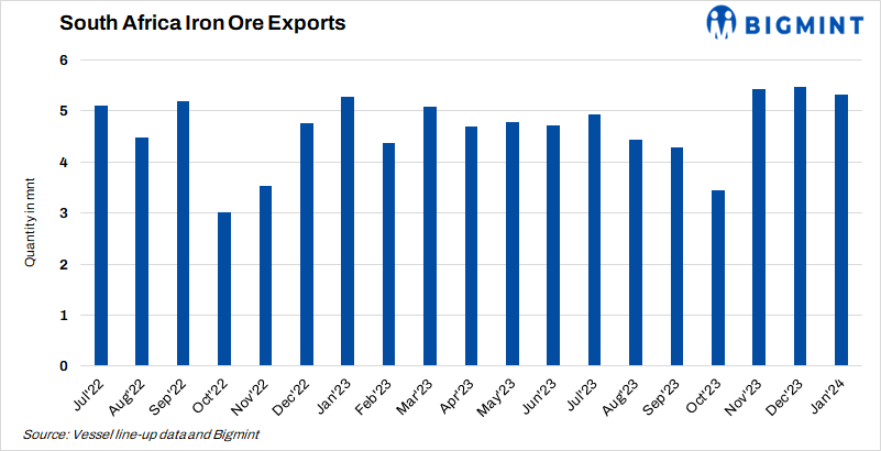 - South Africa’s iron ore exports decreased by 3% m-o-m to 5.31 mnt in Jan’24 compared to 5.47 mnt in the previous month, as per vessel line-up data maintained by BigMint.