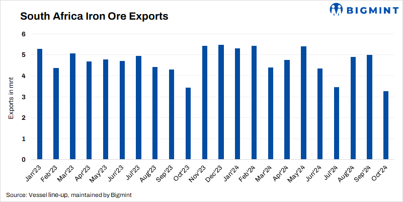 • South Africa’s iron ore exports dropped by 35% m-o-m to 3.26 mnt in Oct’24 compared to 5.01 mnt in Sep, as per vessel line-up data maintained by BigMint.