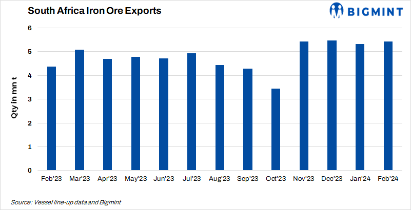• South Africa’s iron ore exports edged up by 2% m-o-m to 5.43 mnt in Feb’24 compared to 5.31 mnt in the previous month, as per vessel line-up data maintained by BigMint.