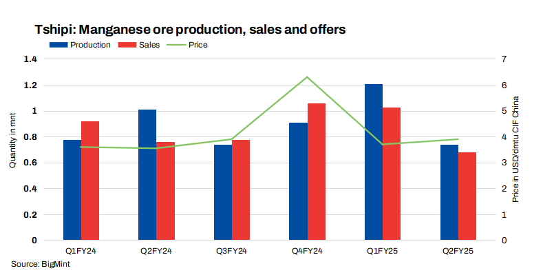In Q4 CY24 (Oct-Dec’24), Jupiter Mines Limited reported a 38% decline q-o-q in manganese ore production from Tshipi mines to 0.74 mnt as compared to 1.21 mnt in Q3CY24. Meanwhile, the sales volume dwell down by 34% q-o-q to 0.68 mnt from 1.03 mnt in Q3CY24. No low grade ore was produced during the quarter, due to less than favourable market conditions. This impacted overall production volumes.