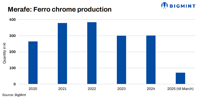 Merafe has decided to suspend operations at its Boshoek and Wonderkop smelters following a review of its chrome pooling and sharing venture (PSV) with Glencore. Boshoek will shut down from 1 May’25, and Wonderkop from 31 May’25. This decision is likely due to rising electricity prices and growing competition from lower-cost Chinese ferro chrome, which is dampening global demand.