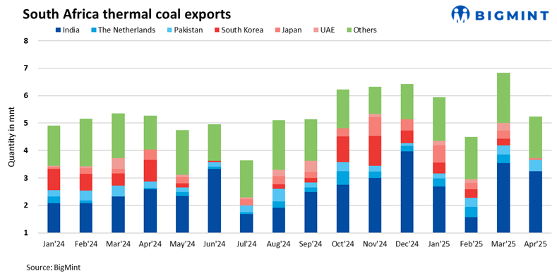 South Africa’s non-coking coal exports fell 23% m-o-m to 5.24 million tonnes (mnt) in April 2025 from 6.83 mnt in March, as per BigMint data. The decline follows a sharp rebound in March and could be attributed to temporary logistical or demand-side constraints. The cumulative export volume for January-April 2025 stood at 22.51 mnt.