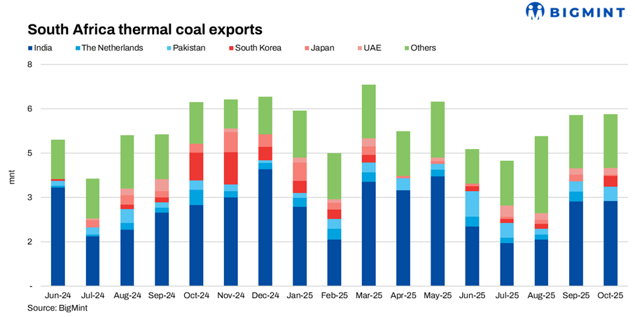 South Africa’s non-coking coal exports inched up 1% to 5.82 million tonnes (mnt) in October 2025 from 5.79 mnt in September. However, exports were down 7% from 6.23 mnt in October 2024. The slight monthly rise was led by continued firm demand from India, which remained the top importer.