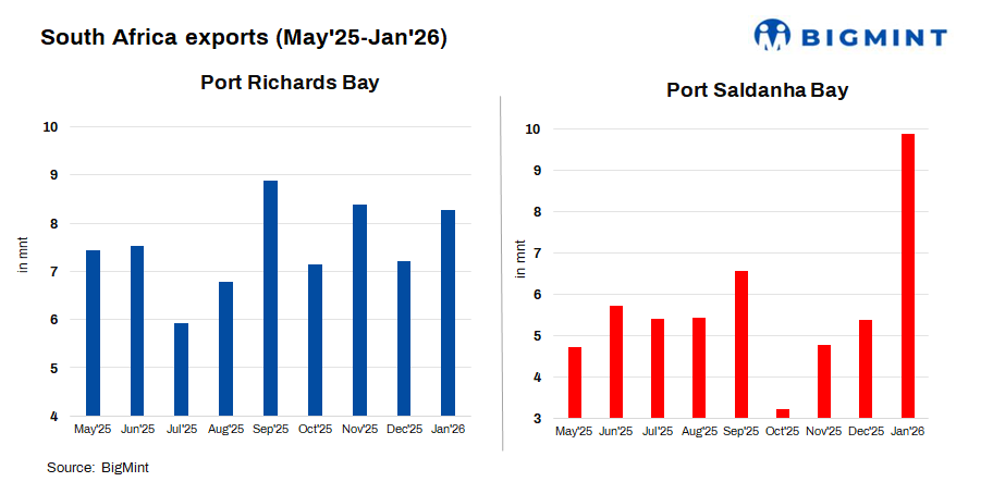 • Saldanha Bay shipments increased sharply by 83.3% m-o-m to 9.88 mnt in Jan’26 (Dec: 5.39 mnt), on improved rail movement and stronger iron ore exports after prior disruptions.
