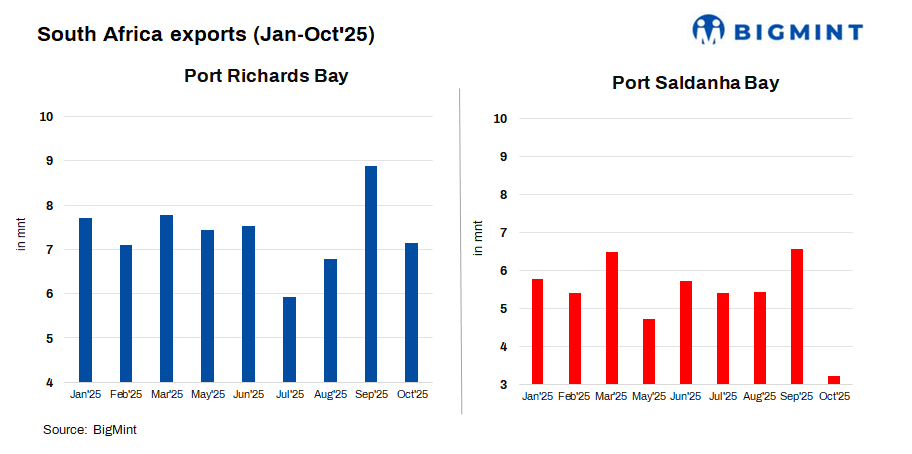 - Saldanha Bay’s shipments witnessed a sharp decline of 51% m-o-m to 3.22 mnt in Oct’25 against 6.56 mnt in Sep.