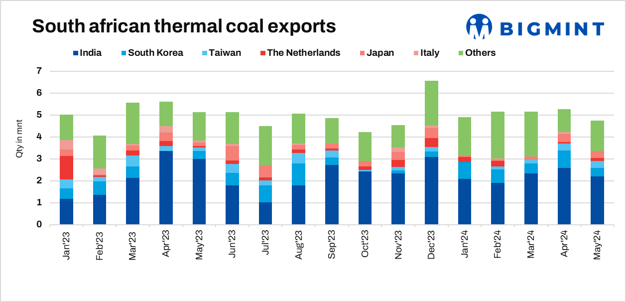 • South Africa’s thermal coal exports dropped by 10% m-o-m to 4.75 mnt in May 2024, as per data maintained with BigMint.