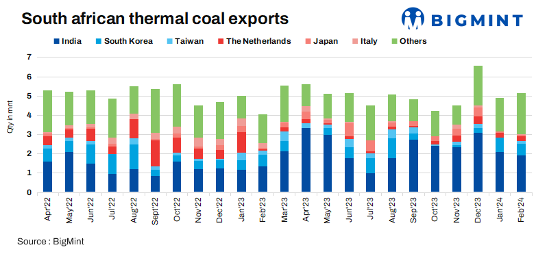 India was the largest buyer of South African coal at 1.91 mnt in February 2024, down 8% m-o-m as against 2.08 mnt in January 2024. Some coastal power plants, as well as steel and cement sectors, were directing their inquiries to South African coal, driven by its attractive prices and smoother supply situation.