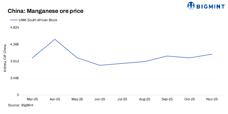 United Manganese of Kalahari (UMK), a leading global manganese ore producer based in South Africa, has set offers for its 36% grade semi-carbonate lumps at $4.10/dmtu CIF China for Nov’25 deliveries, up by $0.1/dmtu m-o-m.