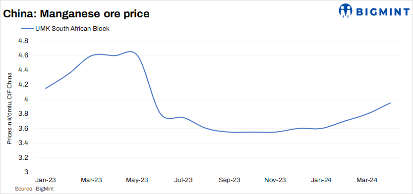 United Manganese of Kalahari (UMK) has hiked offers by $0.25/dmtu for South African lumps (Mn 36%) for May’24 shipments to $4.20/dmtu CIF China. Citing rising handling and production costs, the miner has raised offer prices. This move coincided with a recent uptick in inquiries from key producing nations for shipments scheduled next month, potentially indicating a shift in buyers’ sentiment.
