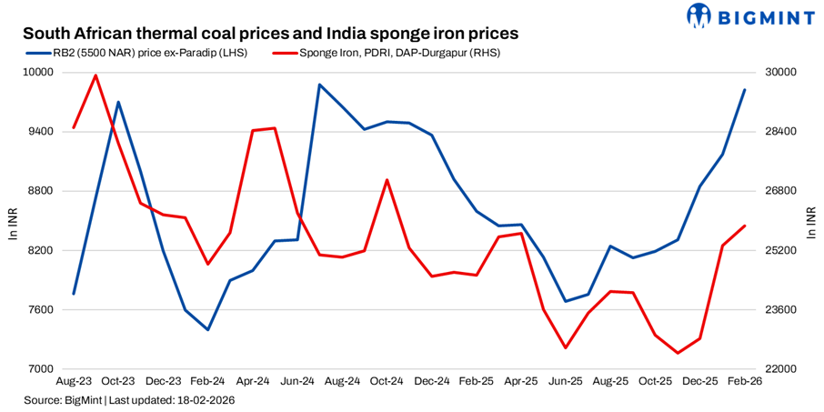 South African thermal coal prices at Indian ports rose sharply w-o-w. As per BigMint-s assessment, exw-Paradip 5,500 NAR increased by INR 550/t to INR 10,350/t, while 4,800 NAR surged by INR 500/t to INR 8,950/t. Export offers for 5,500 NAR rose by $4-5 w-o-w to $90.5/t FOB RBCT, amid mine maintenance and operational disruptions in South Africa, tightening supply and supporting portside sentiment.
