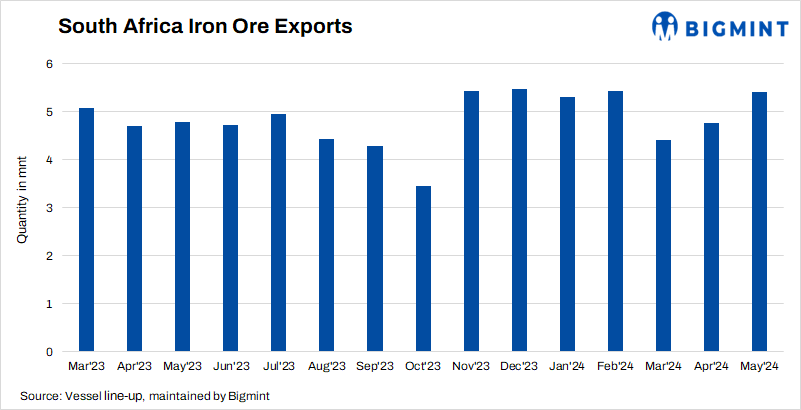 • South Africa’s iron ore exports rose by 13% m-o-m to 5.41 mnt in May’24 compared to 4.77 mnt in the previous month, as per vessel line-up data maintained with BigMint.