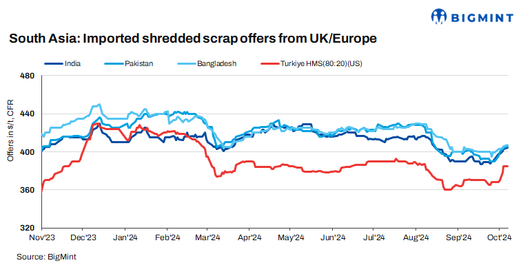Indicative offers for shredded scrap from the UK/Europe were at $405-410/t CFR Chattogram, with HMS (80:20) at $390-395/t CFR.