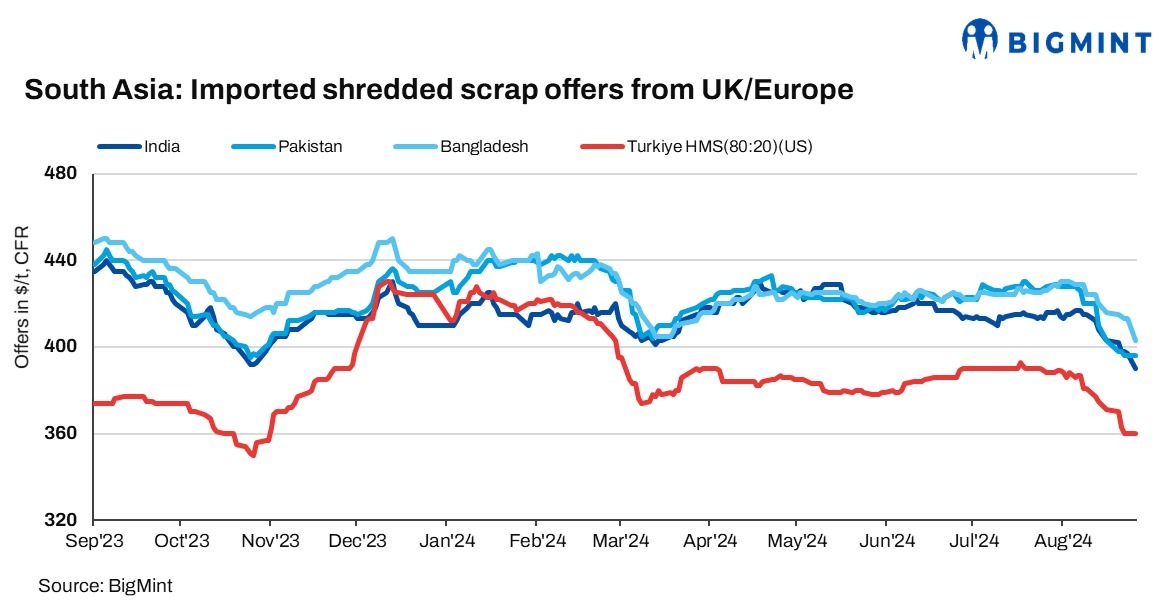 • India: UK-origin shredded scrap indicatives declined by $7/t to $390/t CFR Nhava Sheva from the last closing.