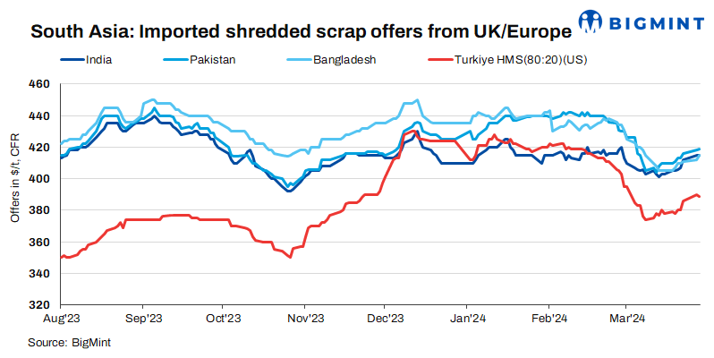 In Bangladesh, buyers are showing a preference for container shipments over bulk due to challenges related to Letters of Credit (LC). Additionally, there’s a trend among buyers to seek quicker shipment destinations such as Australia, Hong Kong, Singapore, and Malaysia. European scrap prices remain unviable for Bangladeshi buyers, prompting them to explore alternatives. Indicative offers for shredded scrap from Europe were reported at $415/t, whereas offers from Australia stood at $418/t CFR.