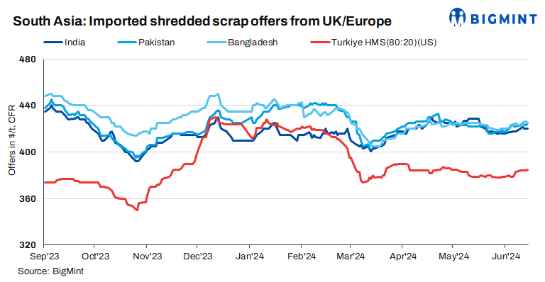 Indicative offers for shredded scrap from the UK/Europe were assessed at $425/t CFR Qasim and $425-430/t CFR Chattogram. HMS (80:20) offers were quoted at $405-410/t CFR Chattogram.