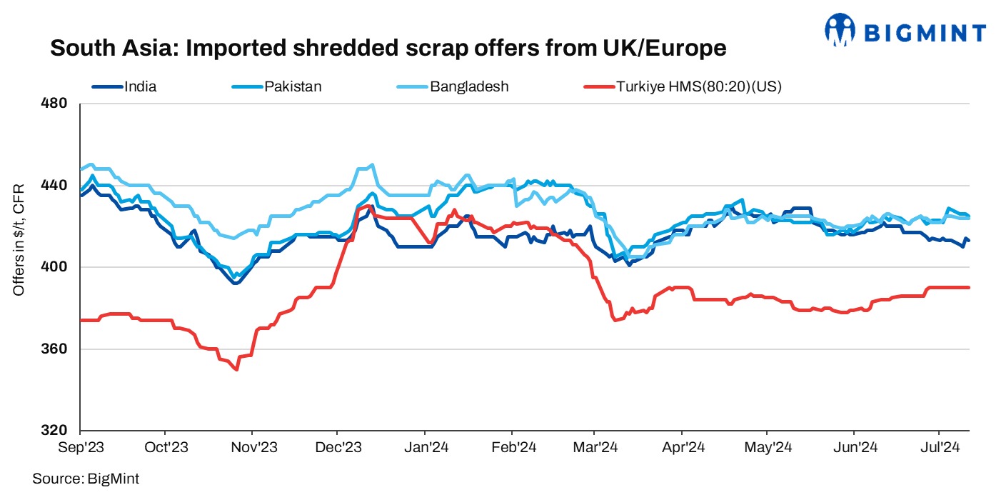 India: In India, demand for imported scrap remained weak due to a continual drop in domestic steel demand and prices, leading to lower scrap intake and a persistent disparity between bids and offers.