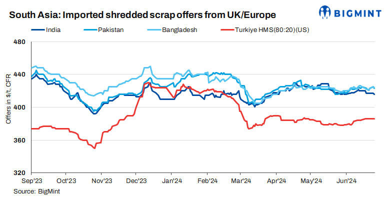 Bangladesh: In Bangladesh, market activities remained limited due to the monsoon season and challenges in opening LCs. Additionally, some participants were still away in holiday mode post-Eid. Indicative offers for shredded scrap from the UK/Europe were assessed at $420-425/t CFR Chattogram, while HMS (80:20) was at $400-405/t CFR.