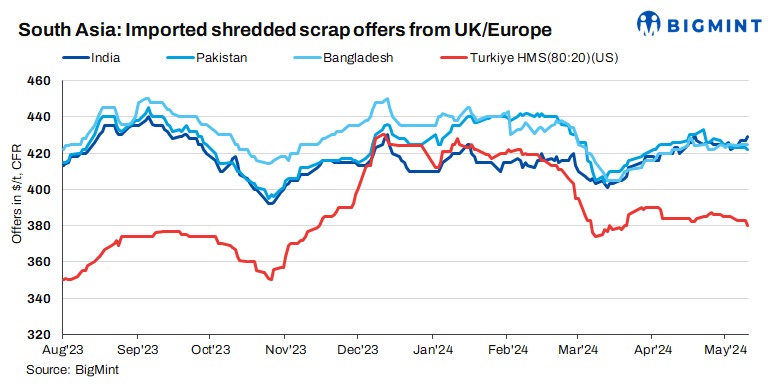 In South Asia, the ferrous scrap market witnessed mixed trends today. Indian buyers showed strong interest in the imported scrap, while Pakistan and Bangladesh exhibited subdued interest. Additionally, approximately 7,000 t of HMS scraps were secured from Australia at $405-410/t CFR Chennai. Reports highlighted Pakistan’s mills running at reduced capacity due to sluggish steel demand, with some temporarily halting production.