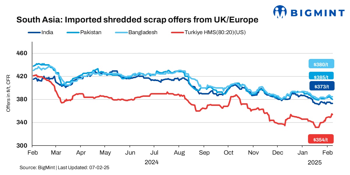 India: India’s imported scrap market remained under pressure as a weaker rupee raised import costs and dampened buying interest. Shredded scrap offers stood at $370-375/t CFR Nhava Sheva, but bid-offer gaps limited deals, while HMS (80:20) from the UK/Europe and West Africa was heard at $345-355/t CFR. Suppliers preferred Pakistan for better prices, and strong US domestic demand kept export availability tight. Additionally, soaring freight rates from the US added to market challenges.