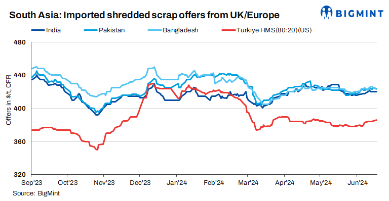 The South Asian ferrous scrap market saw minimal buying today. Indian buyers were disinterested amid domestic steel market slump and bid-offer discrepancies. No firm offers were reported for Pakistan and Bangladesh due to Eid. Shredded offers from the UK/Europe were thus:
