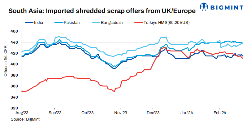 Shredded scrap offers saw a decline of up to $2-3/t in India, Pakistan, and Bangladesh. Additionally, US bulk HMS (80:20) offers to Turkiye also decreased by $2/t today.