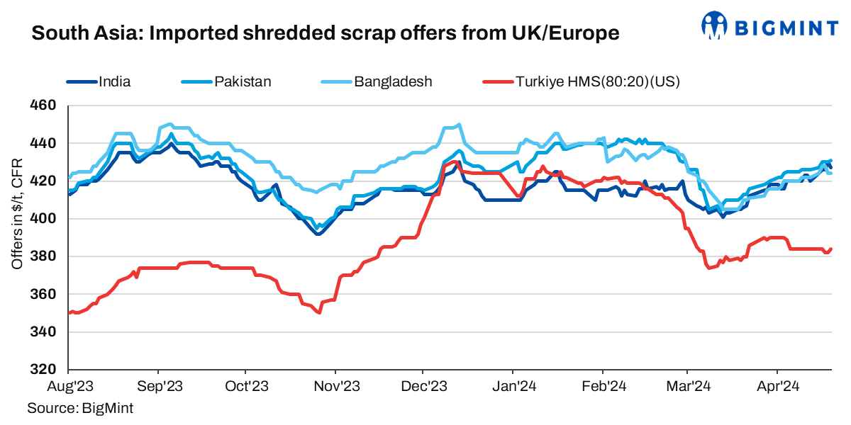 India: Indian buyers are actively pursuing imported scrap due to heightened downstream demand and a scarcity of scrap within the local market. Recent indicative pricing for shredded scrap originating from the US and Europe ranged between $422-430/t CFR, while HMS (80:20) from Europe and West Africa hovered at around $395-400/t CFR.