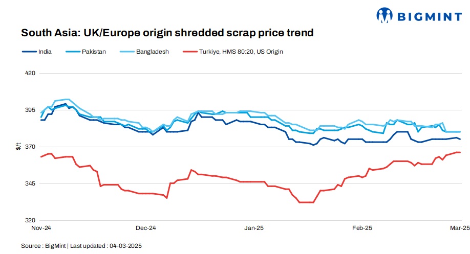 Pakistan: Pakistan’s imported scrap market remained sluggish, as Ramadan dampened buying interest. The segment was further weighed down by weak liquidity and subdued steel demand. Mills resisted high offers, with UK/European shredded at $380-382/t CFR Qasim, though buyers sought $375-378/t CFR. UAE-origin shredded was offered at $385/t CFR but could be negotiated down to $380/t. HMS stood at $358/t CFR, reflecting weak sentiment.