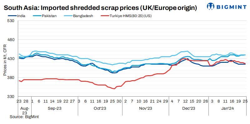 India: In India, demand for imported scrap remained muted due to the substantial price gap between domestic and imported scraps. Shredded scrap offers from Europe were in the range of $410-420/t CFR Nhava Sheva, while bids reportedly dipped below these levels to around $400-405/t CFR. Shredded scrap of Australian origin was observed at $435/t CFR.