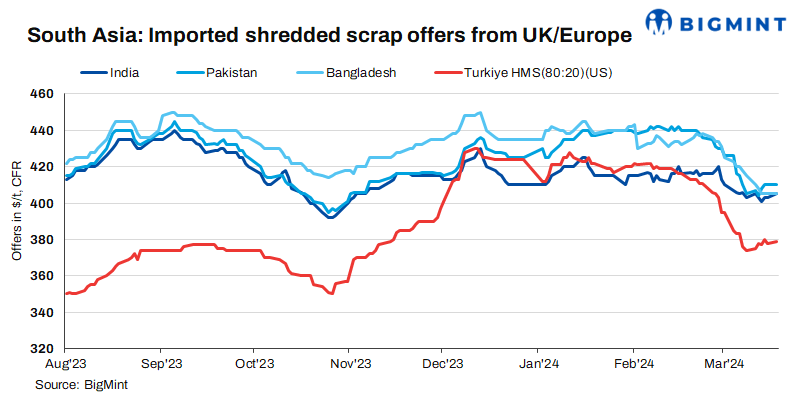 Pakistan and Bangladesh have decreased their purchases of imported scrap due to ongoing Ramadan, anticipating an improvement in demand post-Eid. Indicative offers for shredded scrap to Pakistan were noted at approximately $410-415/t CFR Qasim, while for Bangladesh, they stood at around $405-410/t CFR Chattogram. HMS (80:20) offers to Bangladesh from the UK/Europe were assessed at $395-400/t CFR levels.
