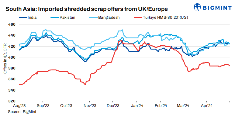Indicative offers for shredded scrap from the UK/Europe hovered at around $425-430/t CFR Qasim.