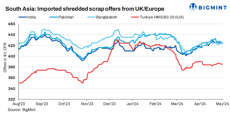 Shredded scrap offers remained unchanged in India and Pakistan, while prices edged down by $1/t in Bangladesh. US bulk HMS (80:20) offers to Turkiye remained unchanged d-o-d.