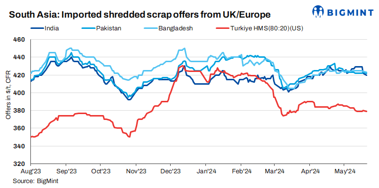 The South Asian ferrous scrap market witnessed a downward trend today. In India, demand for imported scrap remained sluggish as buyers anticipated a drop in prices. Pakistani buyers, facing bearish market sentiments and cheaper domestic scrap, stayed inactive. Meanwhile, in Bangladesh, moderate activity was noted, with a preference for bulk purchases over containers, reflecting strategic buying behaviours amidst fluctuating offer prices.