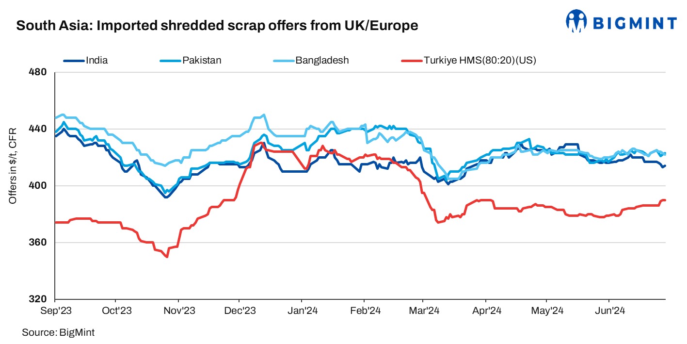 Current UK/Europe offers for shredded scrap hovered at $422-424/t CFR Qasim.