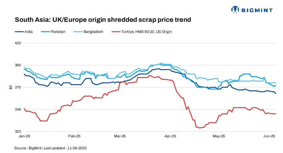 Pakistan: Pakistan’s imported scrap market remained sluggish amid Eid holidays, with containerised shredded heard at $370-375/t CFR Port Qasim. Trading activity was thin, as most mills stayed inactive or operated at minimal capacity, holding off purchases due to high inventories and weak steel demand.