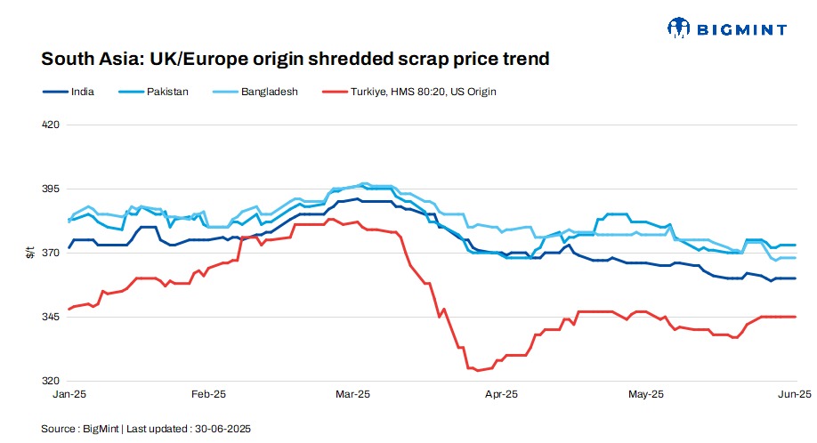 The South Asian and Turkish imported scrap markets remained largely range-bound, weighed down by seasonal slowdowns, weak steel demand, and geopolitical uncertainties. In India, monsoon disruptions and cheaper domestic alternatives curbed appetite for imported scrap, while Pakistan’s buyers awaited clarity on fiscal policies before committing to fresh bookings. Bangladesh saw limited activity post-Eid, with mills deferring purchases amid tepid construction demand.