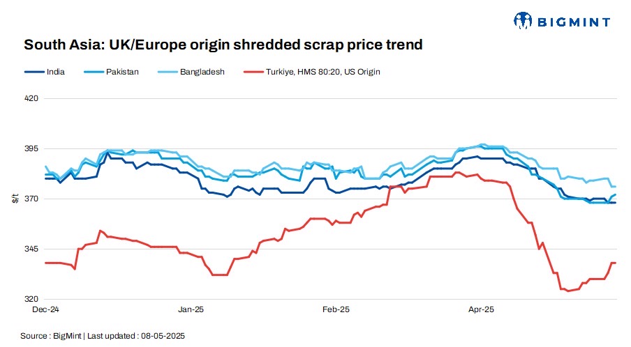 UK-shredded scrap offers remained unchanged in India and Bangladesh, while edging up by $1/t in Pakistan. US-origin bulk HMS 80:20 offers to Turkiye also remained stable d-o-d.