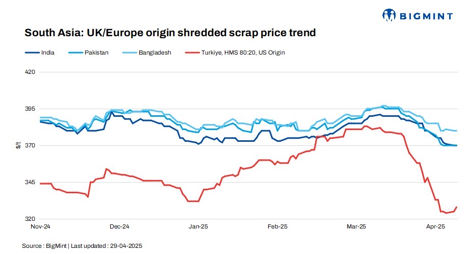 Turkiye: The Turkish imported scrap market held steady, buoyed by two recent bulk deals that supported a slight price uptick. A French-origin cargo was sold to a western Turkiye-based mill at $322.5/t CFR for 15,000 t of HMS 80:20 for May shipment. Additionally, a US-origin cargo was booked by the same mill at $330/t CFR last week. These transactions reflected buyers’ willingness to secure tonnage despite muted restocking urgency and pressured margins.