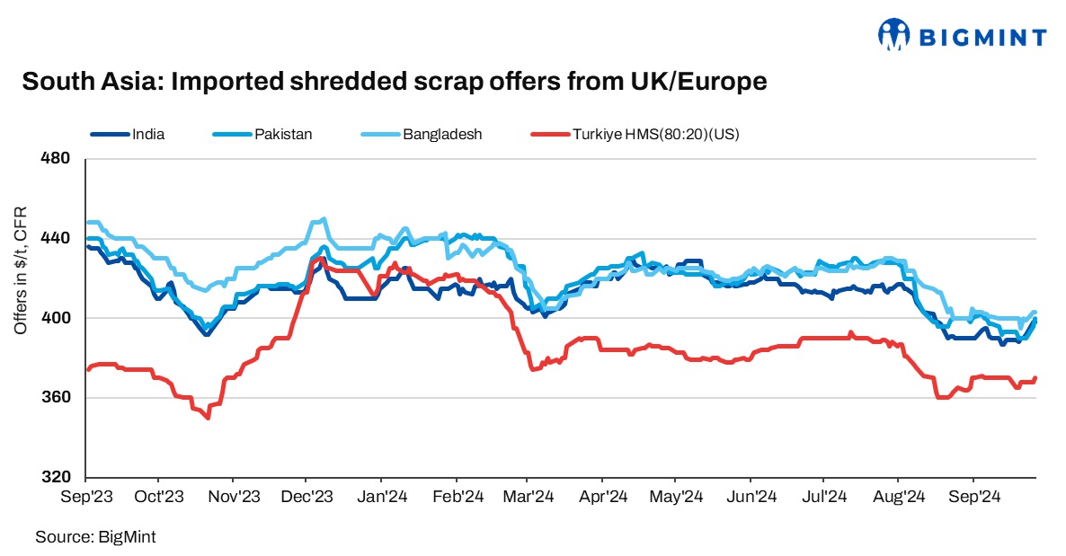Indicative offers for shredded scrap from the UK/Europe were at $405-410/t CFR, while HMS (80:20) was offered at $385-390/t CFR.